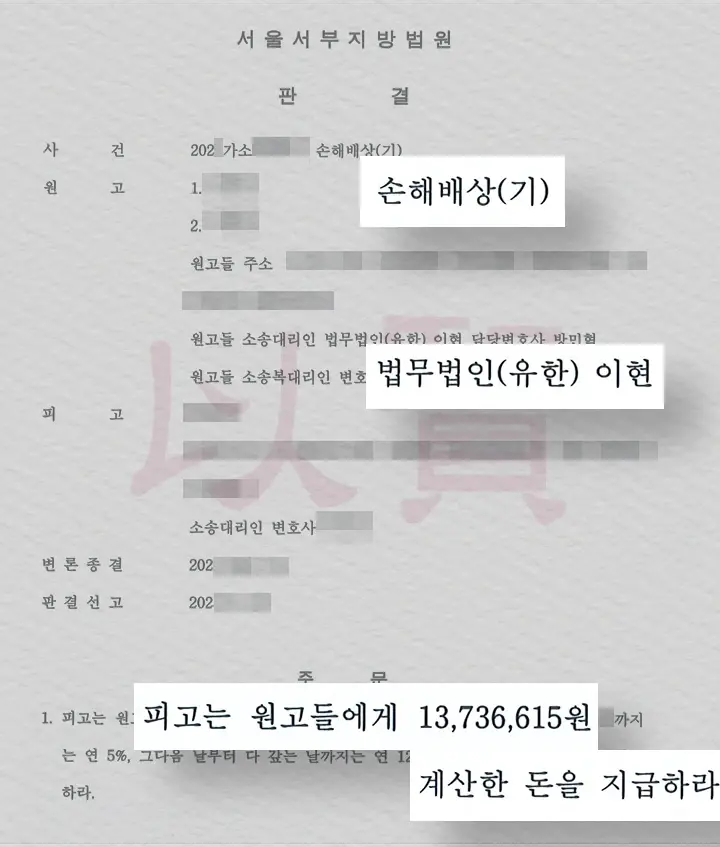 판결문을 받은 날 수진 님은 깊은 안도의 한숨을 내쉬었습니다. 무리하게 인정받기 어려운 항목을 고집하기보다, 가장 중요한 수리비를 감액 없이 완벽하게 지켜냈다는 사실에 매우 만족하셨습니다. 무엇보다 윗집과의 지지부진한 감정 소모에서 벗어나 다시 안방으로 돌아갈 수 있게 되었다는 점이 수진 님에게는 가장 큰 승리였습니다.
