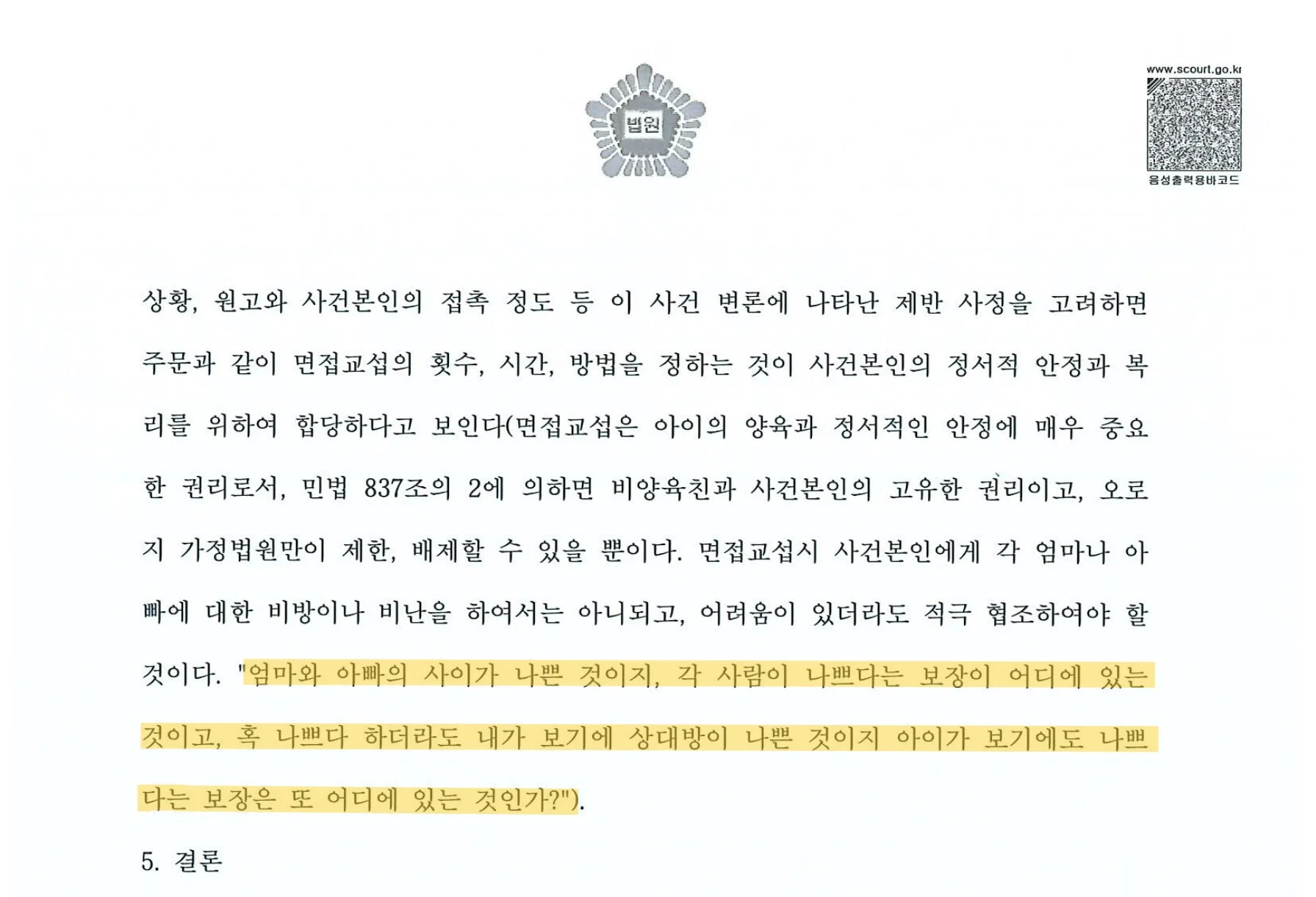 법원은 면접교섭이라는 것이 "천부적인 권리"로서 양육자에 의해 거부될 수 없다고 명시하고 있어요. 설령 이혼 당시 면접교섭을 포기한다는 합의를 했더라도, 민법 103조에 따라 무효이기도 하죠.