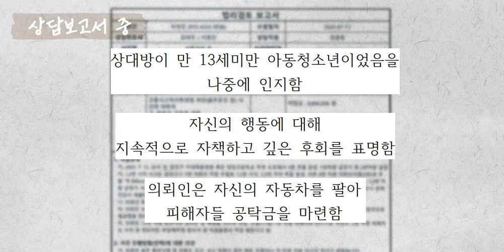 솔직히 말씀드리자면 가능하지만 쉽지 않습니다. 이번 사건에서 라은씨는 13세 피해자 2명을 상대로 성매수에 가담했고 피해자 부모는 어떤 협상도 거절하며 엄벌을 요구했어요. 초범이었지만 저희는 법적 전략보다 행동으로 보여주는 반성이 필요하다고 판단했죠
