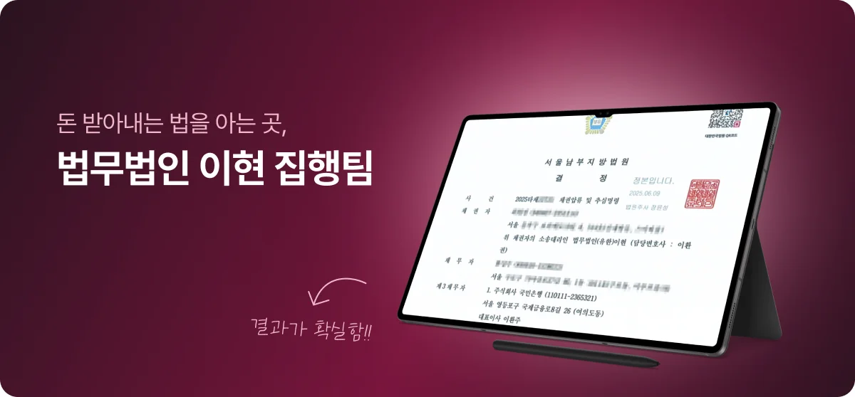 이러한 법무법인 이현 대표님의 명확한 기조 아래, 신용조회 단계부터 판결 이후 강제집행까지를 전제로 사건을 관리하며, 실제 회수를 담당하는 전담 집행팀을 별도로 운영하고 있습니다.