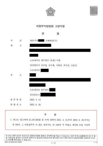 결과적으로 의뢰인은 인테리어 견적(1,000만 원)의 두 배가 넘는 21,127,465원과 지연손해금을 확정받으셨습니다.