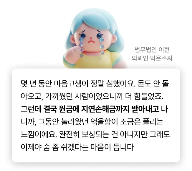 원금(1억 원)을 넘는 금액을 받게 된 것이고, 실질적으로 박은주 씨는 원금 1억 원에 지연손해금 4천만원까지 받게된 것 이었습니다.