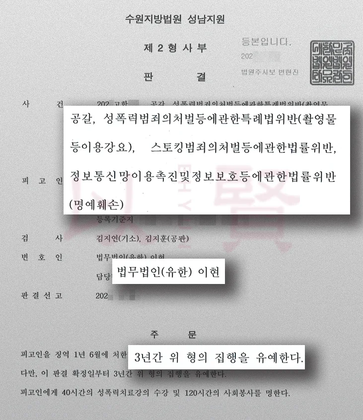 👉 이현 성공사례|[공갈/성폭력처벌법위반/스토킹/명예훼손] 중범죄임에도 선처받은 사례