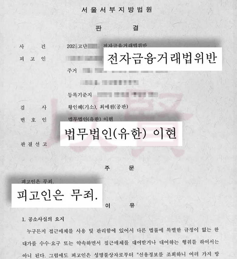 법원은 그게 증명되지 않았다고 판단했습니다. 즉, 이 사건을 대포통장처럼 수고비 받고 넘긴 케이스로 보기 어렵고, 대출광고로 유인된 뒤 대출 절차로 착각하게 만든 기망 사건에 가깝다고 본 겁니다. 그래서 최종적으로 무죄가 선고됐어요.