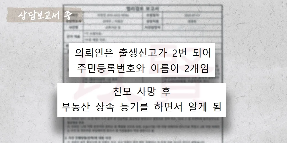 의뢰인은 평생 한 이름, 한 주민등록번호로만 살아왔습니다. 그런데 서류상으로는 전혀 다른 이름과 생년월일을 가진 '또 다른 자신'이 있었습니다.