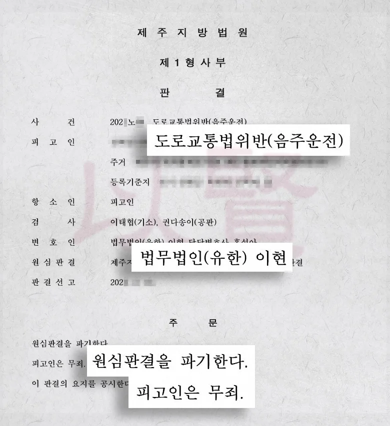 결론적으로, 운전 당시 혈중알코올농도 0.03 이상이라는 점이 충분히 입증됐다고 보기 어렵다며 무죄 판결을 내렸습니다.