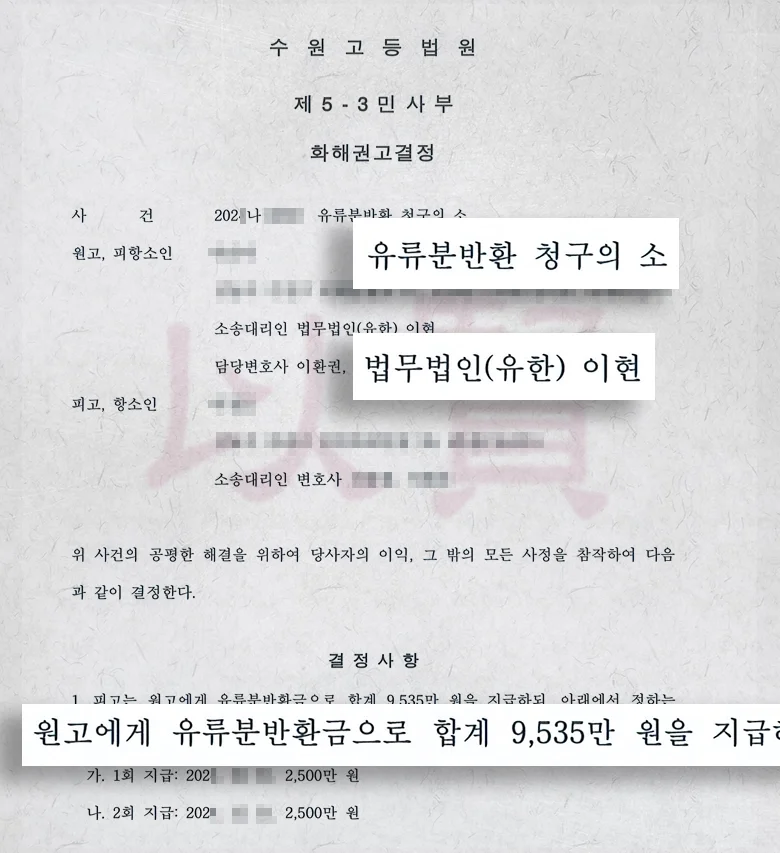 그 결과, 수원고등법원 항소심에서 1심 판결금액보다 약 1,700만 원이 증액된 총 9,535만 원을 지급받는 화해권고결정을 이끌어냈습니다.