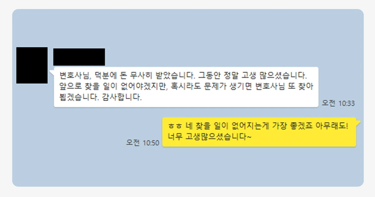 고소 이후 의뢰인분은 상대방에게서 합의를 구하는 연락을 받으셨습니다. 의뢰인 분도 합의를 하길 원하셨어요. 결론적으로 피해액에 대해 돌려받을 수 있었습니다.