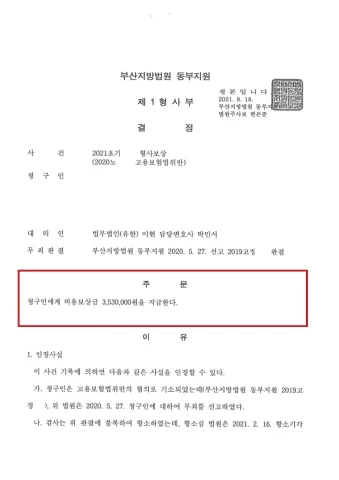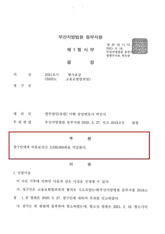 결국 부산지방법원 동부지원은 국가가 A씨에게 형사비용보상금으로 3,530,000원을 지급하라는 결정을 내렸습니다.