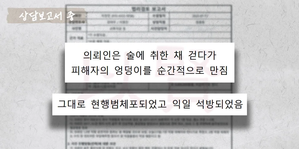 의뢰인은 고령에다 건강 문제로 치료 중인 분이었습니다. 사건 당일 과음을 한 상태였고, 길을 걷다가 순간적으로 피해자의 엉덩이를 만지는 행동을 했습니다. 즉, 계획된 범행이 아니라 술 먹고 추행한 우발적 사건이었던 겁니다. 재판 과정에서 의뢰인은 공소사실을 모두 인정했고, 직접 쓴 반성문을 제출했습니다. 또 가족이 제출한 탄원서, 그리고 심리상담 기록과 금주 실천 노력을 통해 재범 위험이 없다는 점을 강조했습니다. 이처럼 성추행 초범 판결에서는 피고인의 태도와 재범 방지 의지가 중요한 판단 기준이 됩니다.