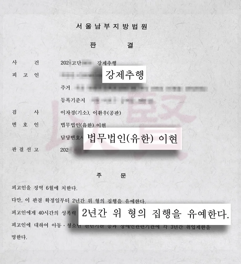 결국 의뢰인은 강제추행 집행유예 사례에 해당하는 판결을 받게 되었습니다.