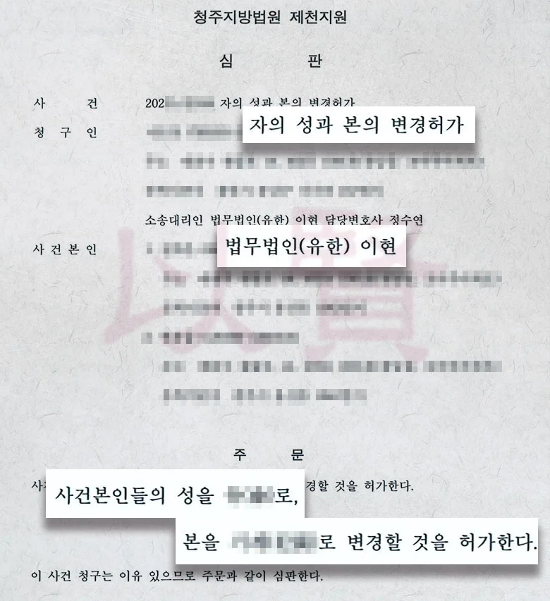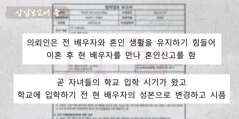 큰딸이 고등학교 입학을 앞두고 있어서 시급했습니다. 아이들도 스스로 "새아빠 성으로 바꾸고 싶다"고 말할 정도였어요. 결과적으로 법원에서 성본 변경을 허가해서 큰딸은 새로운 성으로 고등학교에 입학할 수 있었어요. 이 사례에서 중요한 건 단순히 재혼했다는 이유가 아니라, 친부와의 관계 단절과 새아버지와의 진정한 유대관계가 명확했다는 점입니다.