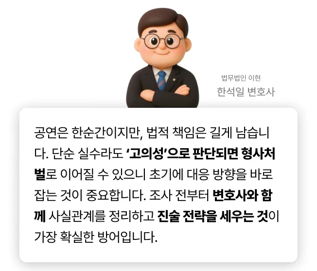 공연은 끝났지만, 사건은 시작되지 않도록 지금 바로 변호사와 함께 대응 전략을 세우세요.