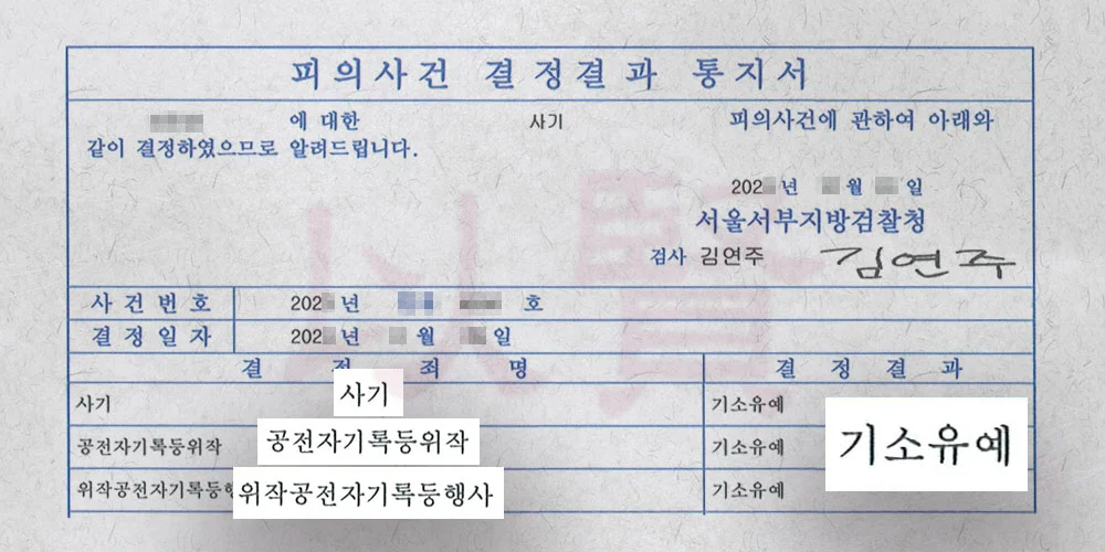 저희는 의뢰인의 반성과 책임 이행을 중심에 둔 의견서를 제출하고 고소인의 동기와 사건 배경을 분석해 보복성 고소임을 소명하며 형사처벌보다는 제도적 개선과 재발 방지를 위한 유예 처분이 타당하다는 논리를 펼쳤죠.