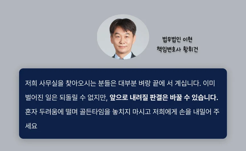 동종전과를 저지르면 많은 분들이 가중처벌로 징역형을 피할 수 없다고 생각합니다. 대부분의 경우에는 맞습니다. 또 다시 집행유예를 받기 위해서는 전략을 촘촘히 짜야합니다. 법무법인 이현이 파악한 이 사건의 핵심은 감정에 호소하는 것이 아니라, 법리적인 타임라인 관리와 판사가 인정할 수밖에 없는 수치를 만드는 것이었습니다.