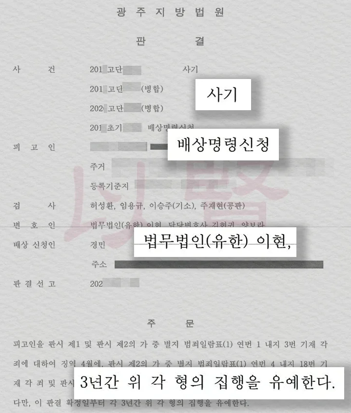 법원은 피고인이 집행유예 기간 중 재범하여 죄책이 무거우나, 법무법인 이현의 조력으로 기존 집행유예 기간이 도과하였고, 대부분의 피해자와 사기죄 합의하여 피해 회복이 이루어진 점을 들어 다시 한번 집행유예를 선고했습니다. 즉, 징역형을 면하게 된 것이죠.