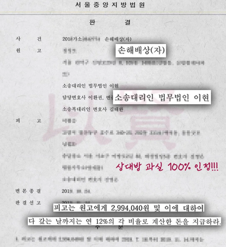 이현은 이 사건에서 상대방 과실 100% 인정, 렌트비는 27일분 인정, 수리비 상당 부분 인정, 감가상각 손해는 입증 부족으로 기각이라는 일부 승소 판결을 이끌어냈습니다.