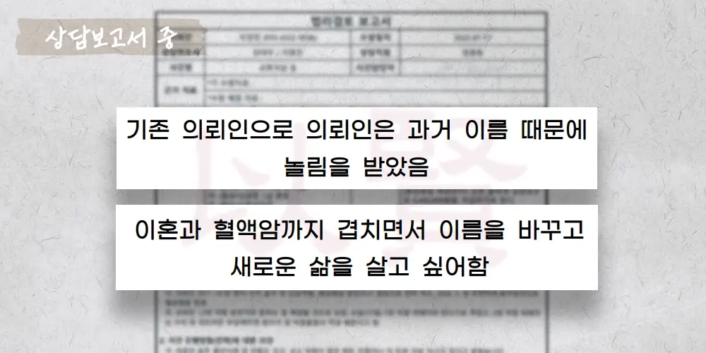오늘 소개해 드릴 사례는 두 번째 개명(재개명)을 위해 저희를 찾아오신 의뢰인 A씨(가명)의 이야기입니다. 특히 이번 사건은 의뢰인이 항암 치료 중이라는 절박한 상황 속에서 진행되었기에 담당 변호사도 그 무게감이 남달랐던 사건이었습니다.