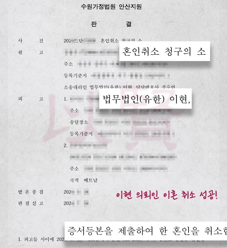 법원은 변호인의 치밀한 논리를 모두 인용했습니다. 재판부는 이혼취소 판결이 확정됨에 따라 원고와 피고 사이의 혼인은 당초부터 이혼하지 않은 상태로 돌아갔음을 확인했습니다. 따라서 피고(남편)가 베트남 여성과 맺은 새로운 혼인은 민법상 중혼 금지 규정을 위반한 것이므로 취소되어야 한다고 판결했습니다.