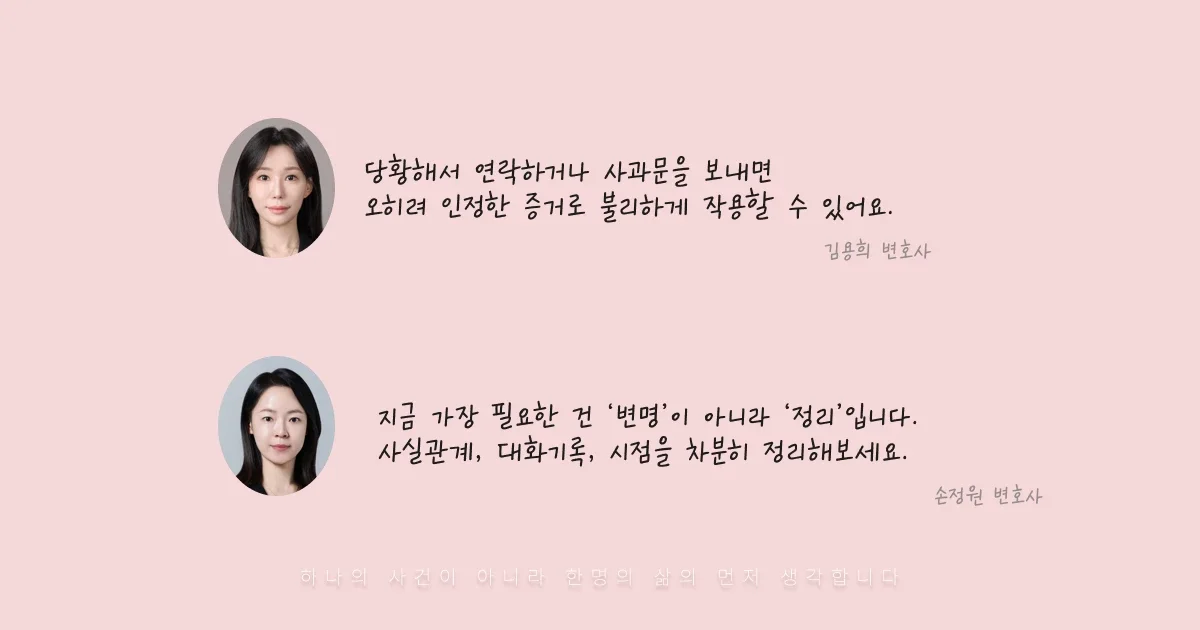 대부분의 피소자는 “오해다”라는 말을 전하고 싶어 상대 배우자나 본인 연인에게 연락합니다. 하지만 이때의 감정 섞인 메시지 한 줄이 그대로 법정 증거가 될 수 있습니다.