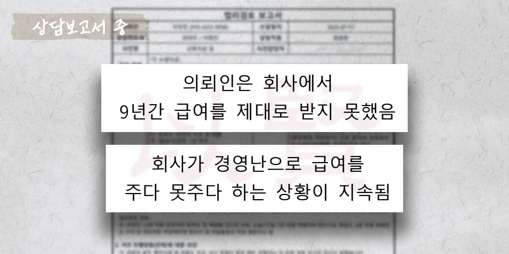 퇴직 시점까지 누적된 금액은 약 2천여만 원. 의뢰인은 결국 저희 이현을 찾아 체불임금을 회수하기로 결심했습니다.