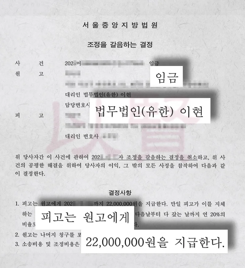 서울중앙지방법원은 저희의 주장을 받아들였습니다. 상대방의 대표자 변경 주장은 받아들여지지 않았고 조정을 갈음하는 결정을 통해 체불임금 2천2백만 원 지급이 확정되었습니다.