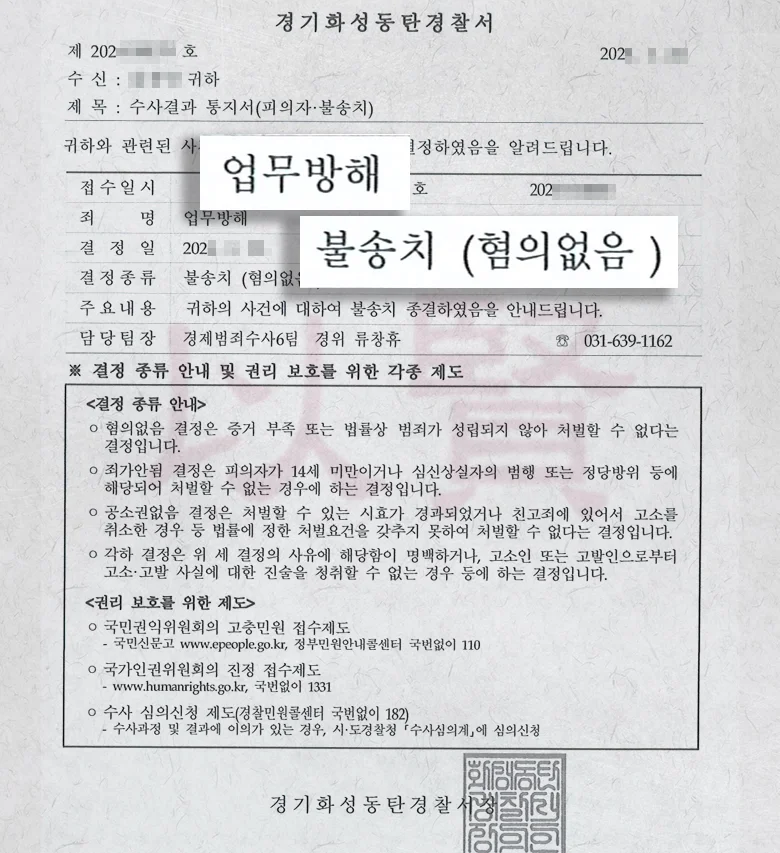 모든 요소가 모여A씨는 ‘혐의없음(불송치)’ 처분을 받았습니다. A씨를 짓누르던 불안과 억울함은 완전히 해소됐습니다.