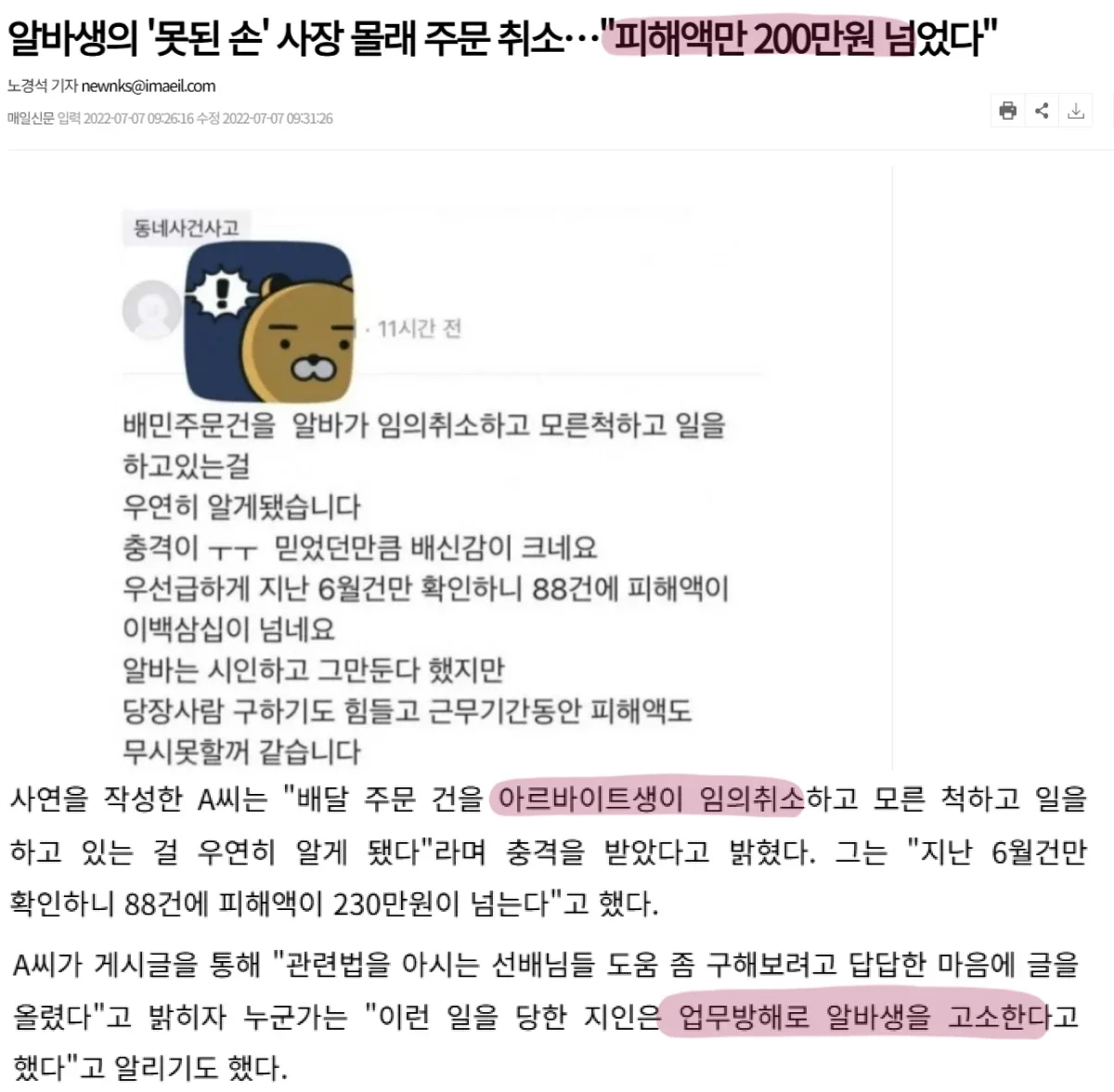A씨가 퇴사한 직후, 업주는 언론에 과장된 내용을 흘렸습니다.