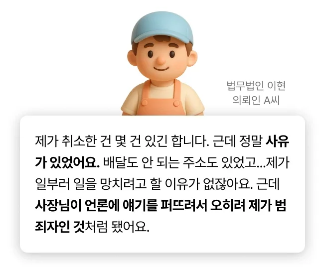 이현은 실제 자료를 근거로 업주 측의 주장이 과장·오류라는 점을 명확히 밝혔습니다. A씨의 모든 취소 기록은 정상적 사유가 있는 ‘정당한 취소’였습니다. 따라서 고의적 방해는 성립할 수 없습니다.